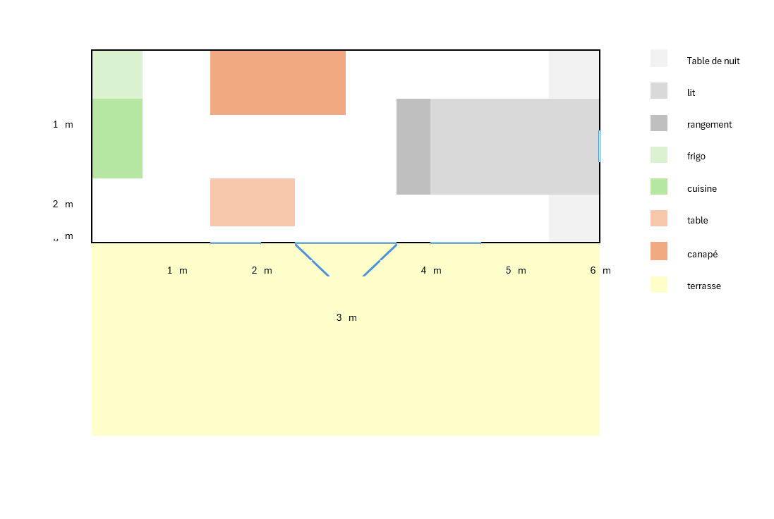 La taille mesure 6 mètres de long et 2m40 de large, avec une terrasse d'environ la même taille, un grand parasol et un jardin.